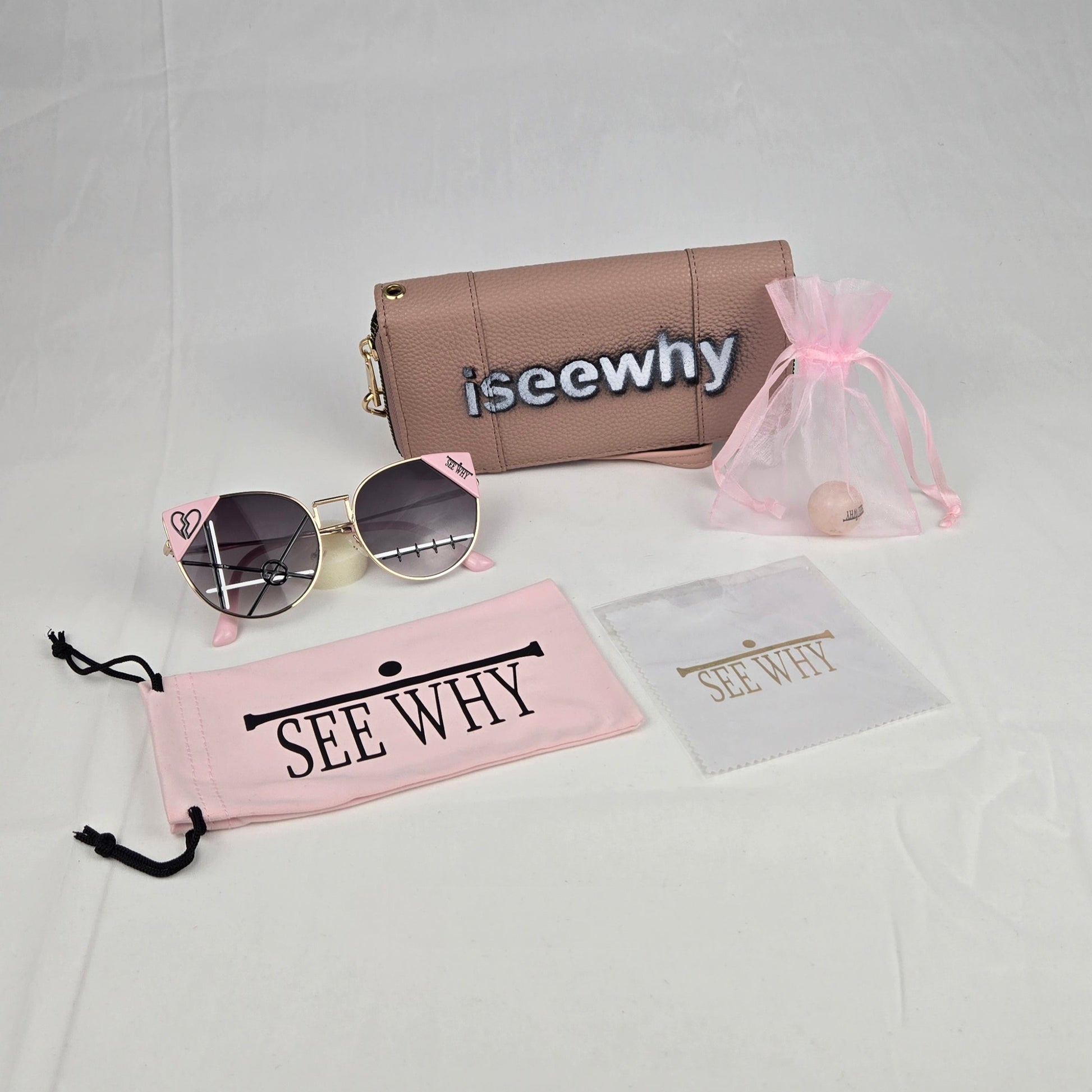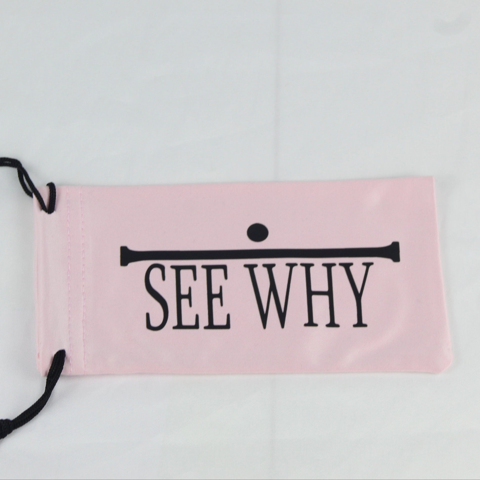 • A soft pink microfiber bag stamped with the ISEEWHY logo