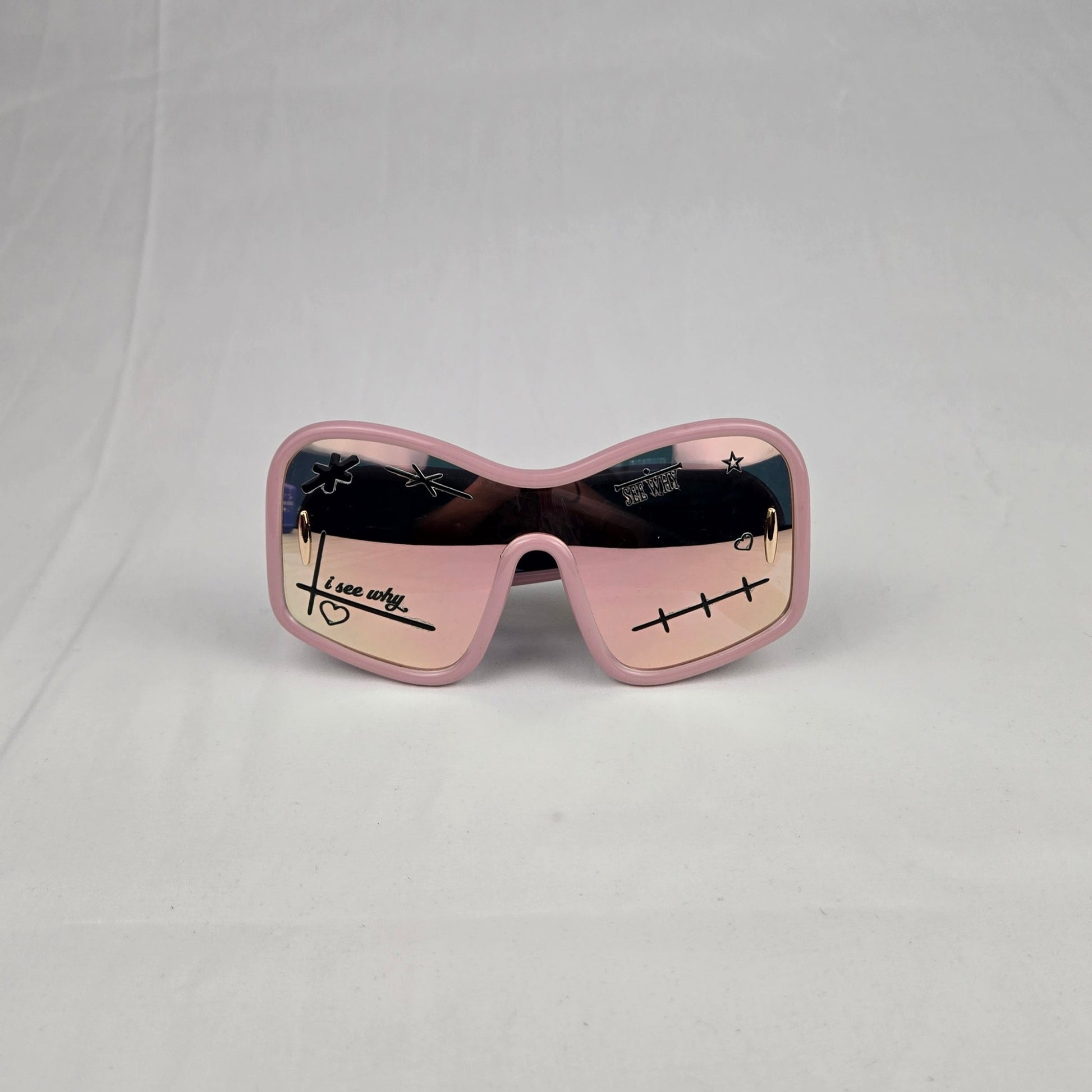 Champagne Tint is a one-of-one design that floats somewhere between soft luxury and runway armor. Featuring glossy pink rims wrapped around reflective, chrome-tinted lenses, this design mirrors light like liquid — catching every angle.