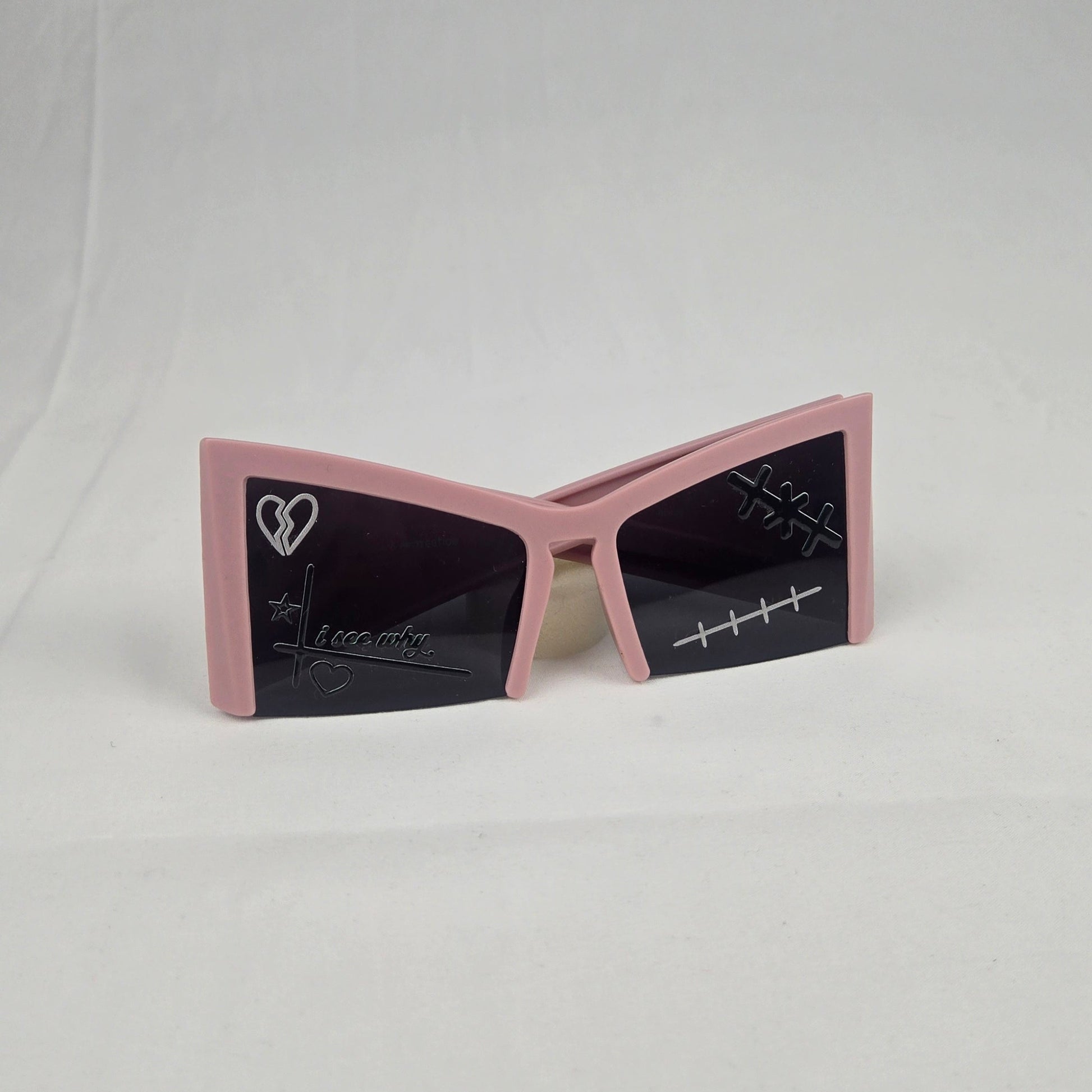 Lip Gloss is a bold frame designed to turn softness into power. Pink arms and deep black lenses give this 1-of-1 piece a blend of street-coded graphics and high-glam energy. Designed and made by hand, every mark on these glasses is intentional — from the stitched heart to the black on black lens design, it’s all part of the vision.
