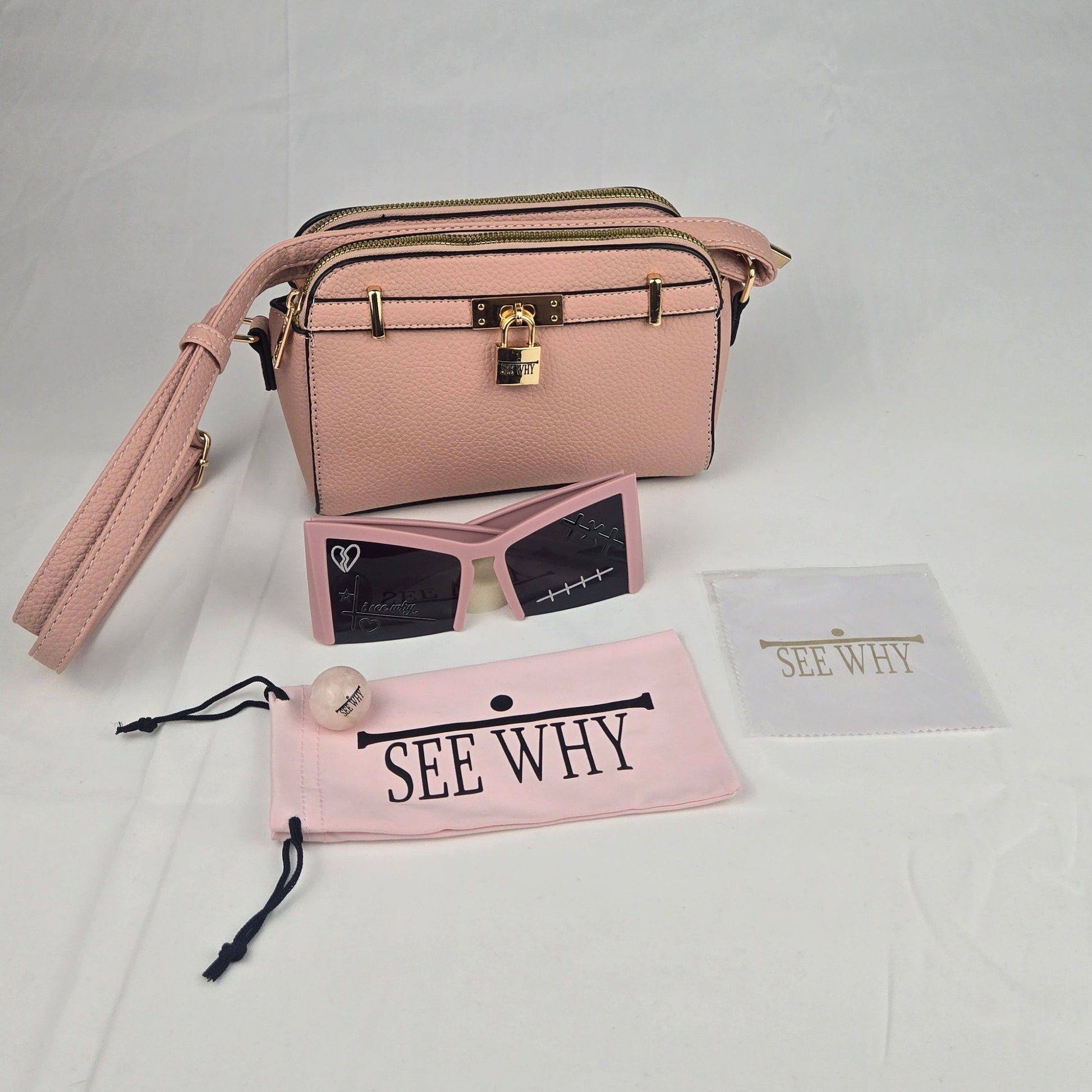 • A pink microfiber bag with the ISEEWHY logo